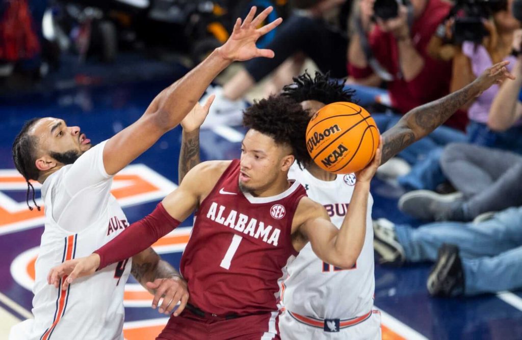 Alabama Crimson Tide player Mark Sears (1) passes out as Auburn Tigers take on Alabama Crimson Tide at Neville Arena in Auburn, Ala., on Saturday, Feb. 11, 2023. Alabama Crimson Tide defeated Auburn Tigers 77-69.An Alabama conference committee to negotiate a gaming package has been delayedOne Senator believes a compromise is closeThe conferees will determine the fate of Alabama sports betting, casino, and lottery