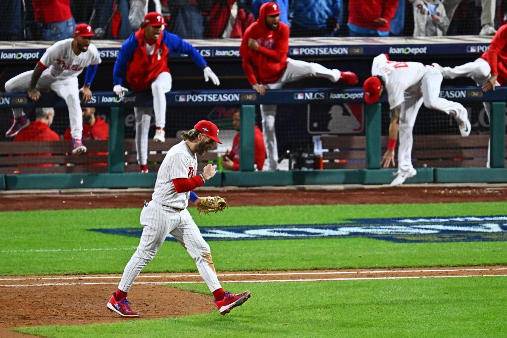 Oct 16, 2023; Philadelphia, Pennsylvania, USA; Philadelphia Phillies first baseman Bryce Harper (3) celebrates after the Philadelphia Phillies beat the Arizona Diamondbacks in game one of the NLCS for the 2023 MLB playoffs at Citizens Bank Park. Mandatory Credit: Kyle Ross-USA TODAY SportsClaim the latest BetMGM promo code and Caesars promo code for MLB playoff betting and NFL Week 7 bettingYou can unlock $2,500 in total bonus bets with these two offersLearn more about how you can claim both promos below