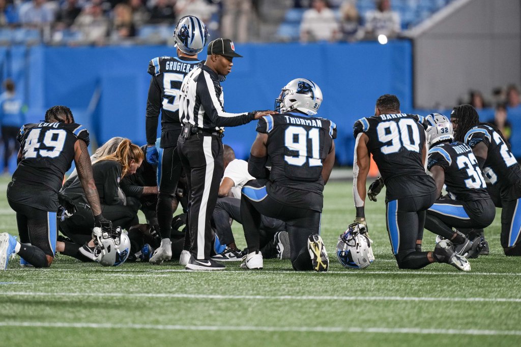 Nov 5, 2023; Charlotte, North Carolina, USA; Carolina Panthers players huddle to check on an injured linebacker Brian Burns (0) during the second half against the Indianapolis Colts at Bank of America Stadium. Mandatory Credit: Jim Dedmon-USA TODAY SportsIn the Panthers vs Bears injury reports & inactives for the Week 10 TNF game, there’s a significant number of Carolina defenders who are outBoth LB Brian Burns and CB CJ Henderson are out for the Panthers with concussionsBears QB1 Justin Fields (dislocated thumb) will miss his fourth successive game