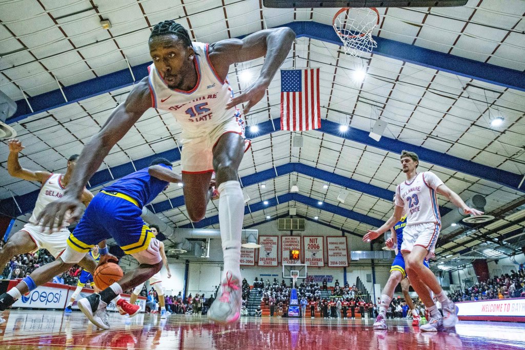 Delaware State University Hornets forward Wesley Oba (15) braces for a fall as University of Delaware Blue Hens guard Jalun Trent (2) moves the ball during the annual men’s basketball game at DSU’s Memorial Hall in Dover, Wednesday, Nov. 15, 2023. The Hens won 78-67. © Benjamin Chambers/Delaware News Journal / USA TODAY NETWORKA bill to expand online sports betting in Delaware was not approved prior to the legislative session adjournment on June 30The bill would have opened up the state to six total online sports betting operatorsBetRivers will remain as the only online sports betting operator through a partnership with the Delaware lottery