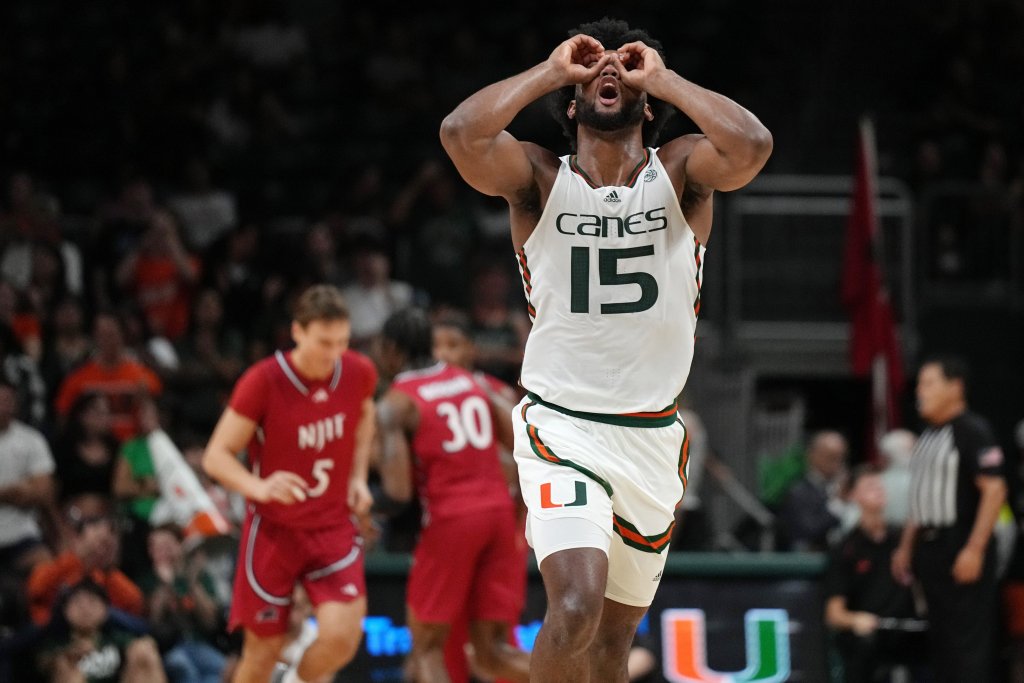 Nov 6, 2023; Coral Gables, Florida, USA; Miami (Fl) Hurricanes forward Norchad Omier (15) reacts to his team scoring in transition against the N.J.I.T Highlanders in the second half at Watsco Center. Mandatory Credit: Jim Rassol-USA TODAY SportsA heavyweight matchup between Miami and Kentucky is on Tuesday’s college basketball scheduleComing off a Final Four run and perfect this season, Miami still finds itself a big underdog in LexingtonSee the Miami vs Kentucky odds, predictions, and expert picks for Nov. 28